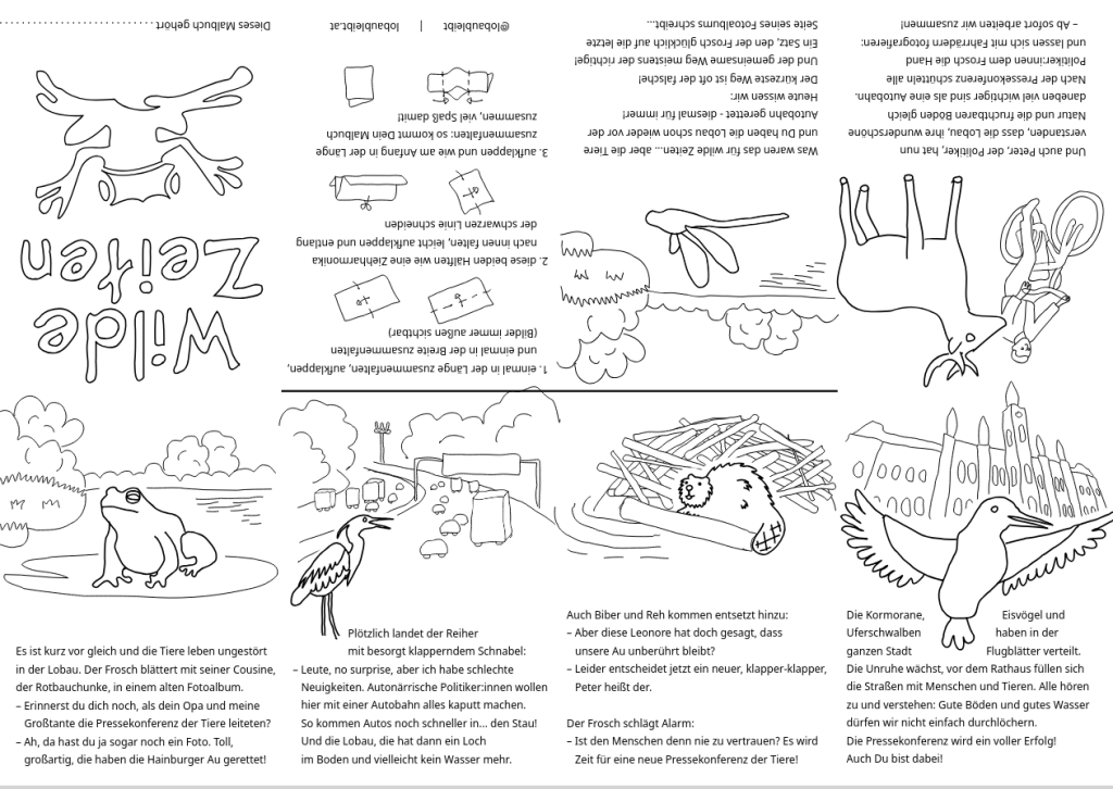 So sieht es im Ganzen aus und läßt sich mit wenigen Handgriffen zu einem kleinen Malbüchlein falten: Mit den Tieren der Au zum selbst ausmalen!