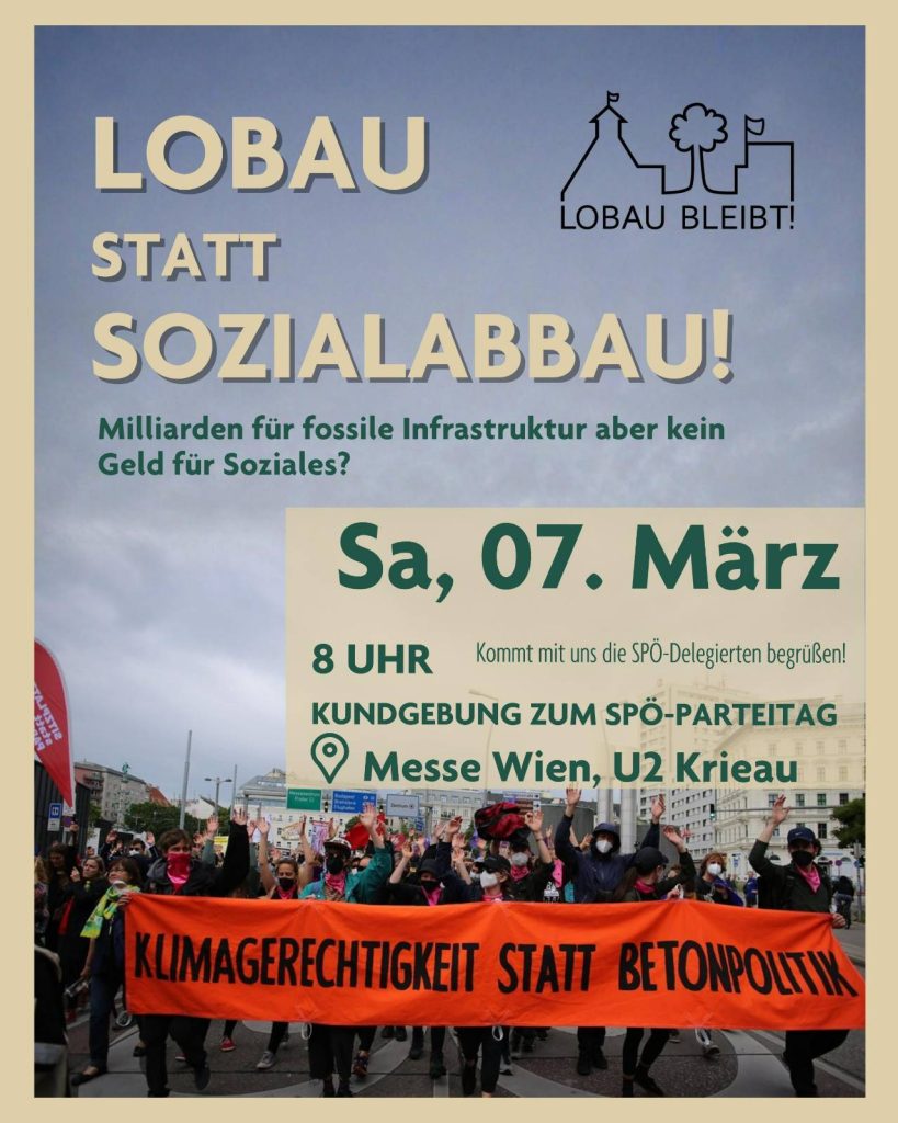 7.3. Kundgebung: Lobau statt Sozialabbau! Veröffentlicht am 22.02.26 von Jutta Matysek in Aktionen, Demos, Hintergrundinformationen, News, Presseaussendungen, Veranstaltungen Schlagwörter: Lobau-Autobahn, Lobaubleibt!, S1 Spange, Verkehrsalternativen