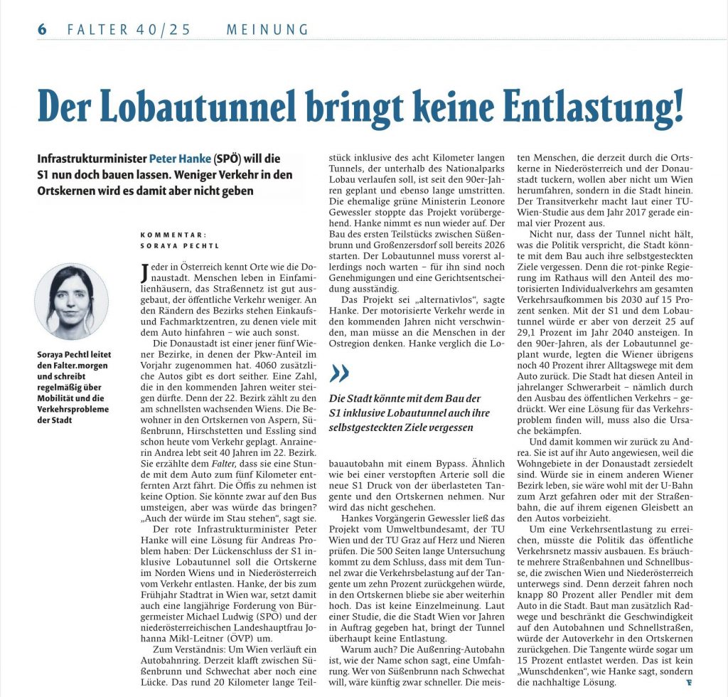 Der Lobautunnel ist sauteuer und keine nachhaltige Lösung für heutige und künftige Verkehrsprobleme, im Gegenteil. Das Projekt geht auf Pläne aus Anfang der 1990er Jahre zurück und ist nicht mehr zeitgemäß. Mehr Infos zum Thema hier: https://vcoe.at/.../wieso-der-lobautunnel-keine-zukunft-hat